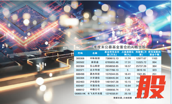 其中,光模块龙头中际旭创蝉联公募头号重仓股。截至一季度末, 超1100只基金重仓持有中际旭创,持仓总市值占流通股比例近12%。