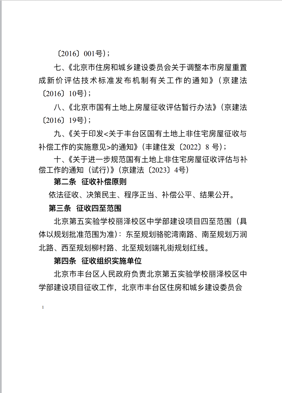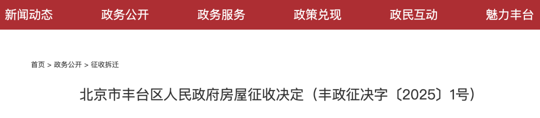 近日,丰台区人民政府官网发布北京市丰台区人民政府房屋征收决定(丰政征决字〔2025〕1号),用于北京第五实验学校丽泽中学部建设。